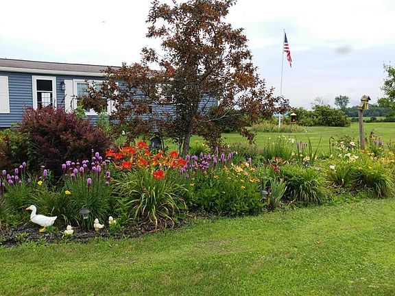 ENJOY THE QUIET & PEACEFUL SUNRISE AND SUNSETS! Enjoy the open, bright & spacious one level living ranch w 2 car detached garage w/ storage loft and 5+A. Huge center breakfast island in the modern kitchen with charming brick surrounding the range, open dining with stone gas fireplace, and builtins, lvrm with sliders to back long deck overlooking colorful perennials, and gorgeous & serene meadow views. energy efficient Leased Solor Power-$71+/mo. New furnace, windows siding w insulation, doors, flooring, and composite frt porch w modern vinyl railing. Cash or Manufactured Housing Financing options available.