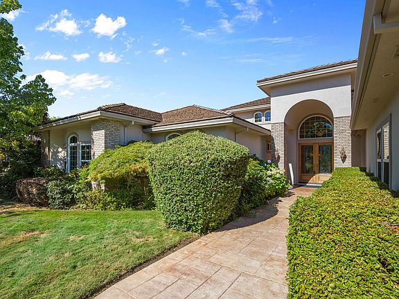 Tucked behind the gates of the prestigious Island Pointe community, a one-of-a-kind opportunity awaits—this custom-built masterpiece has had only one owner. Perched on the 12th tee of Rogue Valley Country Club, the 4,118 sqft single-level home was designed for both comfort and grandeur. Step inside to be impressed with soaring ceilings, a dramatic wall of windows, cozy gas fireplace, and built-in TV—an entertainer's dream. The heart of the home, a chef's kitchen, is equipped with granite counters, double ovens, a warming drawer, and thoughtful pull-out cabinetry. The luxurious main suite offers a spa-like escape with jetted tub, walk-in tile shower, dual vanities, and a grand closet. A second primary suite on the opposite wing creates ideal flexibility for multigenerational living. With 5 bedrooms, 4 bathrooms (3 with heated floors), a 4-car garage, remote patio awning, and more, this exquisite home offers luxury living with breathtaking golf course view.