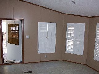 Exterior Features: Single story white double-wide trailer. Home sits on an acre of land, large yard, nice mature trees. Roof is solid and has no leaks, side patio/porch is covered and in great condition. Soffits and eaves are in decent condition, home has parking available on the right side, gravel drive. Interior Features: Living room is partially carpeted and vinyl. Walls are white, with brown wood trim, ceiling fans and a working fireplace. The Kitchen is in excellent condition, vinyl flooring, cabinets, counter-tops, dish washer, refrigerator and sink. The master bedroom has brown carpet, white walls, wood panel trim and a ceiling fan. The master bath includes a large jacuzzi tub, stand up shower, toilet and sink. The second bedroom has Pink walls, brown carpet, room is tiny. The third bedroom is carpeted, white walls, wood trim and textured ceilings. The common bathroom has all appliances, tub, toilet and sink, all intact. HVAC was found and in good condition