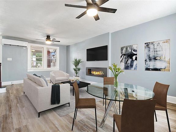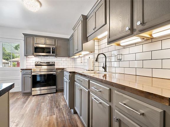 Pristine & wonderful 2 bedroom, 1 bath starter home in Palmerton. This light-filled, recently updated home offers sleek upgrades & a modern, calming space. The spacious, open concept living room and dining area lead to the fully renovated kitchen. The kitchen boasts brand new SS appliances and faucet, subway tile backsplash and tons of cabinet storage. Plentiful hardwood countertop space with under cabinet lighting is a cooking enthusiasts dream. Off the living room, is an all-season enclosed sunroom with a/c and heat, great for a cosy, bonus living space or a quiet den. Upstairs, 2 bedrooms and a full bathroom. Other upgrades include stylish light fixtures & laminate flooring throughout. Each room features powerful, mini split cooling and heating systems. Laundry hookup is in the basement, with much usable space. Outside features a fenced-in backyard & detached one car garage. Close to local amenities, major roadways: 248, 209 and PA Turnpike for easy commute. Book your showing today!
