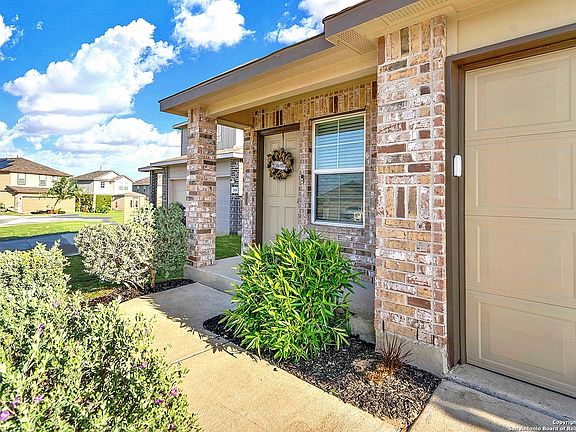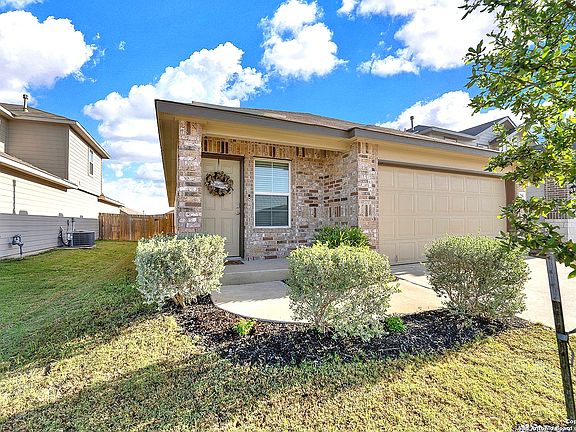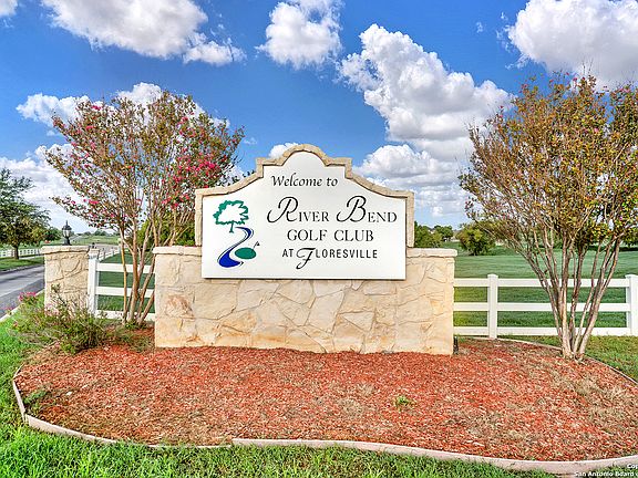 Welcome to the Links at River Bend! This master-planned community is located in Floresville, TX, less than 30 minutes away from downtown San Antonio. You'll find endless activity options for you and your family such as spending some time out on the green at the community's championship 18-hole golf course, clubhouse and golf shop. Grab a bite to eat at Lew's Patio & Grill, an onsite restaurant just minutes from your doorstep. Stay active on the walking trail, tennis courts or disc golf course located throughout the community. This home is a Beautiful one-story home featuring 3 bedrooms, 2 baths, and 2 car garage. The entry opens into the open floor plan, living area, dining area and kitchen area. The kitchen includes a breakfast bar with beautiful granite counter tops, black/ stainless steel appliances, corner pantry and connects to the large, combined dining and family room. The primary suite features a grand walk-in shower and spacious walk-in closet. The standard rear covered patio is located off the kitchen. Additional features include sheet vinyl flooring in entry, living room, and all wet areas, and full yard landscaping and irrigation. This home includes, front doorbell, front door deadbolt lock, Home Hub, Light Switch, and Thermostat.