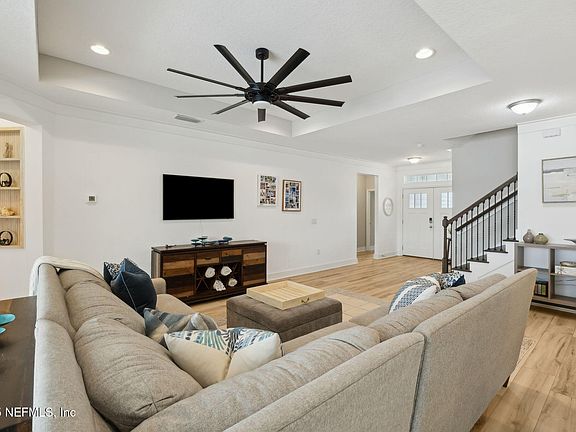 Come fall in love with this stunning pool home located on a peaceful lake in the highly desirable community of Beacon Lake. Vacation in your own backyard!! Pool is heated AND cooled so you can swim year round. Pool features a sun deck with built in recliners, large spa and all surrounded by a marble patio. Custom summer kitchen has green egg, gas flat top grill, dbl burner, fridge and sink. Step inside to this stunning home w/ upgraded LVP floors throughout the home. Chefs kitchen w/ large island, tile backsplash opens to eat in area w/ custom cabinets overlooking the oversized family room and all opening to covered patio with fenced yard and incredible views. Master suite is a dream with glamour bath with oversized walk in shower, dbl vanities and closet w/ organizers. Two more bedrooms on first floor. Upstairs is large bedroom/2 closets/full bath and a balcony overlooking backyard. Home is within walking distance to K-8 school, amenity center with its stunning Lakehouse!