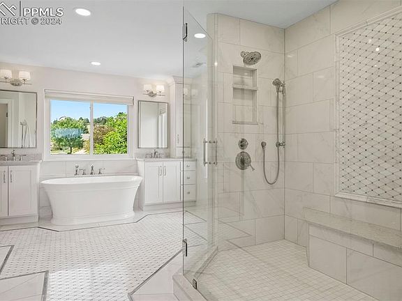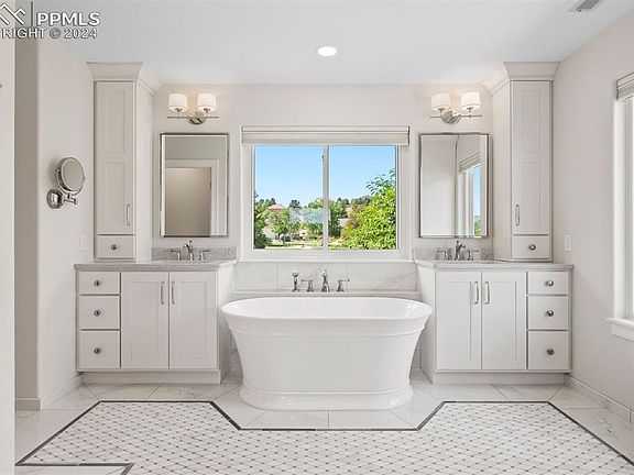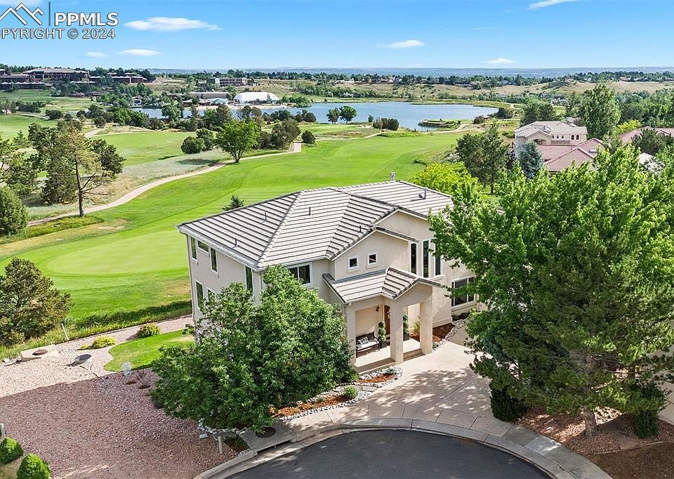 This impeccably renovated home backs to the 15th green of The Country Club of Colorado and is nestled on a cul-de-sac inside a gated community within the coveted D-12 school district. Unbelievable views of the golf course, Front Range mountains, nature, wildlife and 35-acre lake are present from nearly every room. Main-level renovations include opening the kitchen to living/dining room, new hardwood floors, windows and UV window film, light fixtures, and fresh interior wall and bright white ceiling paint. Recent HVAC addition features 2 independent air handlers and provides whole-house comfort. The primary bedroom ensuite is 5-piece perfection and features timeless design elements to include marble tile, quartz counters, porcelain vessel tub, extra-large shower with multiple shower heads, and Brizo polished nickel hardware. Reimagined upstairs laundry room offers custom cabinetry and quartz counters. Main-level media room includes new cabinets and countertops, marble backsplash, and blackout shades. Office has new custom built-ins and has scenic mountain views. Kitchen is bright and airy and includes a new Bosch refrigerator and dishwasher. Quality construction is present throughout, with tall ceilings and the consistent use of superior materials adding to the luxurious feel and enduring quality of this home. This home provides an ideal place to entertain and features multiple gathering spots, composite decking, and lower walk-out patio into the backyard. Get ready to host a party every July 4th as the CCC fireworks go off in your new backyard. Say goodbye to yard work and shoveling snow as this is covered by the HOA. Located on the neighborhood's premier lot, this home features all the amenities of the Broadmoor area with parks, trails, sidewalks, restaurants, and shopping. Beautiful yet practical, luxurious yet inviting this is the epitome of Colorado living merged with a resort lifestyle.