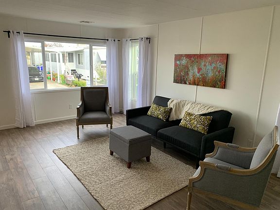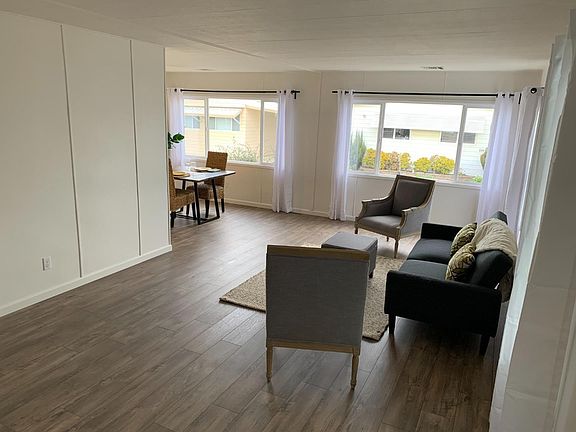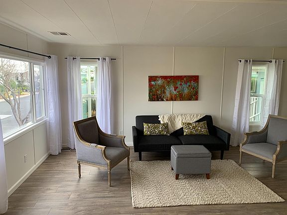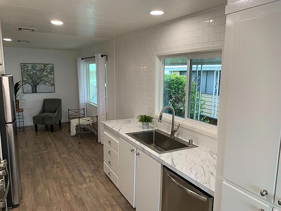 Fully Remodeled! No Property Taxes! Double Pane Windows. Stunning new white gally kitchen with new cabinetry, new appliances, and new countertops. New lighting and new flooring. Spacious Living and Dining Room. Area to the left of the kitchen for Office or Den. Beautiful new bathrooms in the main suite and guest with new vanities, tub and shower. Freshly painted inside and outside. Two Bedrooms and two full bathrooms. Located in the highly desirable Mission Bay Mobile Home Community. This is a Senior (55+) community. Space rent is $1256.