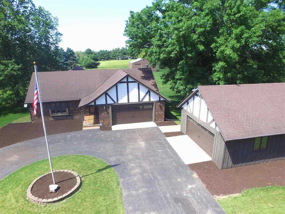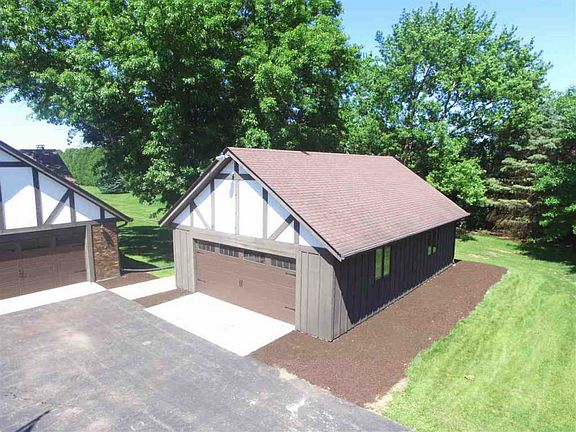 5 ACRES BOONE CO zoned A-1 AG! Country living, county taxes! Belvidere North schools. Modern Tudor style. ATTACHED 2 car garage, DETACHED 4 car garage 24x36 w/elec, 2 overhead doors & svc door, upper lvl storage;both have updated overhead doors; & OUTBUILDING 36x45 w/elec & water, skylights. 1/2 circle dr, tree line provides privacy, new carpet & paint. Updated kitchen w/SS appl, granite countr-tps, tile backsplash, wine rack,rm for table,open to FR. Brazilian cherry floors. L-shaped combo LR/DR. Nice wood ceiling in large fam rm w/brick wall wd burning FP, & slider to 24x20 deck. Hallway bath=updated cabinets, granite countrtp, tile. Master BR=walk-in closet, private bath(updated cabinet, granite countrtp)&slider to deck. 2nd BR w/walk-in clst. Upper lvl used for 2 ADDITIONAL BDRMS-(potentially a 5 BR HOME) or use as master suite, home ofcs, in-law suite, teen rms, or rec rm, w/2 walk-in closets, & storage. Huge LL used as wood shop. Updated furnace. Partial brick front,covered porch.