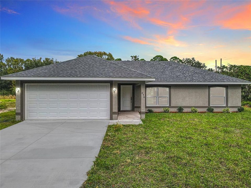 Spacious Open Single Floor Plan with High Ceilings features 3 bedrooms, 2 full bathrooms with a 2 car garage. This beautiful home includes floor wood faux tile in all wet areas including living and dining room along with upgraded 5 l/4” baseboards throughout. The gorgeous kitchen boasts granite counters with extended island for ample space for seating at the breakfast bar, high quality 42’ cabinetry with soft close hinges, and stainless steel appliances. Also has an inside laundry room. Enjoy relaxing in your beautiful oversized owners retreat that includes a sizable walk-in closet. Master bathroom that also includes matching granite counter, double vanity sinks and tiled walk-in shower with glass door. This beautiful home also features double pane windows and architectural shingled roof. No HOA on .37 of a acre!! This home is centrally located between Orlando and Daytona Beach, close to schools, shopping and the interstate!