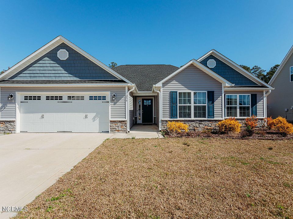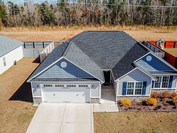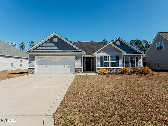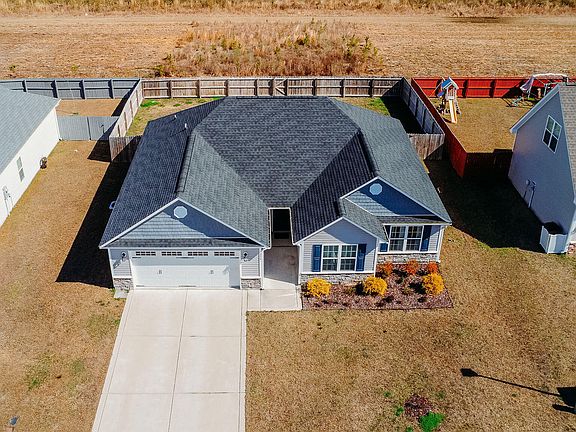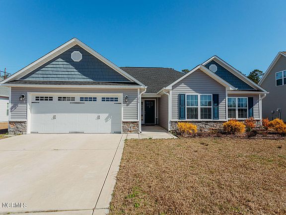Welcome to 256 Wood House Drive in the Stateside neighborhood. Here you are conveniently located behind Stateside elementary, while still being close by to additional area schools along with Camp Lejeune, New River Air Station, restaurants and shopping. This home features 3 bedrooms and 2 full bathrooms. You will find LVP flooring and carpeting throughout the home. As you walk through the front door you are welcomed into the foyer which opens into the spacious living room. In the living room you will find a vaulted ceiling and a cozy electric fireplace. The living room flows into the dinning room which has a glass sliding door to access your fenced in backyard and patio, perfect for summer bbqs. The dinning area opens into the kitchen where you will find beautiful granite countertops and plenty of cabinet storage space. Along with stainless appliances, the kitchen has a large pantry and a bar for extra seating. From the kitchen you'll be lead down a hallway where you will find a linen closet, a full bathroom and two of your spacious bedrooms with large closets. On the other side of the house you will find another closet and your laundry room. The laundry space is roomy so you will not feel crowded as you tackle your laundry and it also leads out into the attached 2 car garage. The primary suite can also be found on this side of the home. In there you'll be met with a trey ceiling which adds to its appeal. You'll find a extensively sized walk in closet, as well as an en-suite bathroom which includes a double vanity and a separate soaking tub and shower. This charming home is waiting for you to come take a tour.