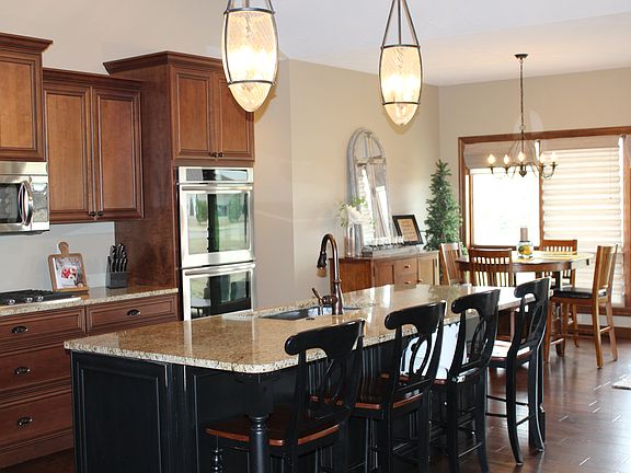 Beautiful custom home only minutes outside of town! This home is set on 1.25 acres with a golf course view. It features vaulted ceilings, wood floors, granite counter tops in kitchen & baths. 3 bedrooms on the main floor and one bedroom is finished in the basement. Oversized 2 car garage and plenty of room for a building or shop! This home has a concrete storm shelter in the basement, kids playhouse under the stairs, lockers in the laundry room, and a covered patio!