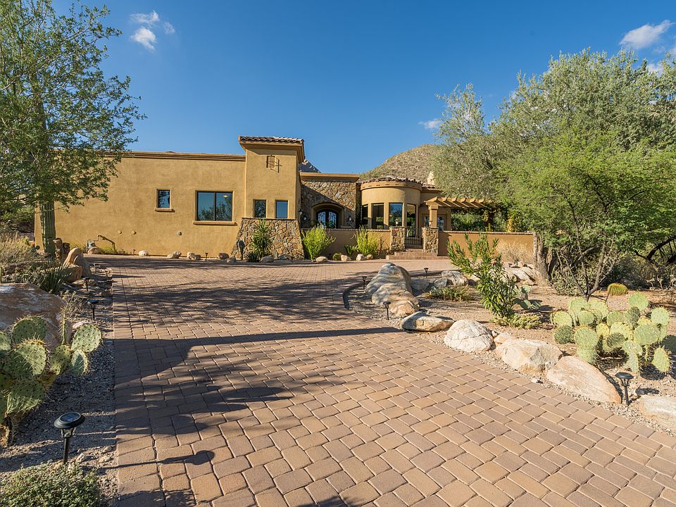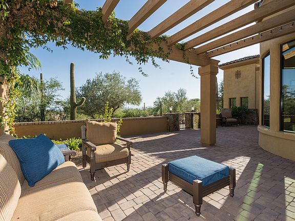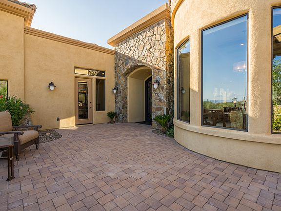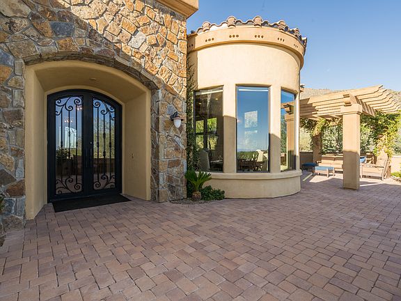 Exquisite 2013 Tuscan luxury on lush corner lot with intimate mountain views and glimmer of city lights. Brick pavers line driveway and patios. Entertain alfresco to enjoy multiple covered seating areas, beamed pergola and new outdoor kitchen! 4/4 3351 SQFT interior blends contemporary wide open, clean-lined, light-filled spaces with Mediterranean elements to create a warm casual elegance. Living areas are covered in creamy travertine and rustic alder woodwork with walls of windows that bring the outside in. Massive great room with soaring beamed ceilings and gas fireplace focal-point is open to Chef's kitchen boasting granite, stunning cabinetry, SS appliances, a Bertazzoni Range and a generous island and pantry. Newer Sin Vacas home with desirable upscale finishes, a must see!