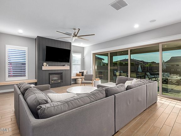 Welcome to indoor/outdoor living at its finest! Showcasing an expansive cornerless sliding door that connects the patio to the gathering room, kitchen and dining nook, this home is a dream for entertaining. In the oversized backyard oasis, you will find a refreshing pool with baja shelf, gas heater and attached spa, travertine patio with built-in gas barbeque and bar, and artificial turf ideal for parties and outdoor recreation. Indoors, this home features a custom entertainment wall with built-in fireplace, an oversized quartz island in a modern white kitchen, double ovens and an upgraded pantry to house your coffee bar or small appliance garage. The primary suite is a retreat with a soaking tub and large steam shower and a well-appointed closet that offers access to the laundry room. Two of the bedrooms include en-suite bathrooms and the third bedroom also has a bathroom next to it with every bedroom in the house boasting a walk-in closet with customized built-in storage. The split third car garage is air-conditioned and designed for versatility, offering the perfect space for a home gym, flex room, or workspace, with direct entry to the home. Upon garage entry, utilize a dedicated mudroom to keep all the clutter contained. Every aspect of this home has been thoughtfully designed to embrace luxury living. This home is located on a cul-de-sac in a single-story, gated community. Combined with its proximity to the Gilbert Regional Park, schools, shopping, healthcare and freeway access this home is a must see.