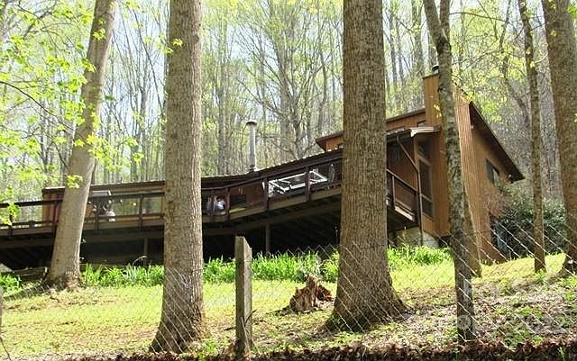Rustic contemporary home with sounds of rushing creek(which is the boundary line on the west side) & mountain view from up top of property. Neat & Cozy. Large deck to entertain, sit & relax plus enjoy the sounds of nature, creek & view. Interior consists of cathedral ceilings w/exposed beams/solid wood board walls with open Great room with wood fireplace & wood stove, kitchen/eating area, utility area, mud room, bathroom, plus bedroom & bath off great room. Steps lead upstairs to bedroom & catwalk to small loft area with twin bed or sewing room(lots of possibilities)& attic storage space. On the exterior is a storage building on locust posts with a small loft area which you can drive to or a short walk.. Land consists of a little over 4.6 acres with creek, wooded & small open area and shared driveway with neighbor. Owner likes to hunt. There is deer, rabbits, raccoons, bears and other wild animals.