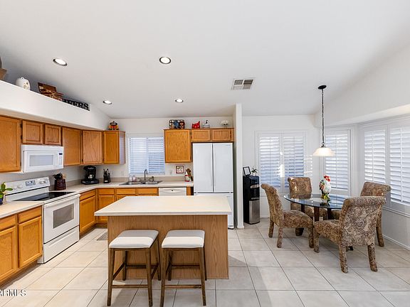 This stunning 4-bedroom, 2-bath home offers the perfect blend of comfort and style. The open-concept living area boasts vaulted ceilings, a cozy fireplace, and plenty of natural light. The kitchen features ample cabinetry and a breakfast bar, perfect for casual dining and entertaining. The renovated master bedroom includes a luxurious bathroom with modern finishes and a spacious walk-in closet. Enjoy the convenience of indoor laundry and a two-car garage for extra storage and parking. Step outside to your private backyard retreat, featuring a covered patio, twinkling string lights, and a sparkling pool. Perfect for outdoor gatherings or quiet evenings under the stars. This home is ideal for Arizona living. Don't miss out on this beautiful gem!