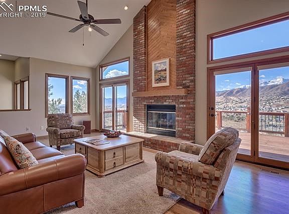 Breathtaking views abound with sweeping views of Pikes Peak, Garden of the Gods, Cheyenne Mtn & city lights from the wrap around deck with gas fireplace, benches, planter boxes, protected by enclosed glass for year round enjoyment. Built by R W Stout Construction, builder of top quality homes. Spacious rooms abound. Sunlight filters thru large windows creating scenic views from mountains, pines, & open spaces. Lots of oak hardwood on the main level + Brazilian cherry hardwood in dining room. Remodeled kitchen with