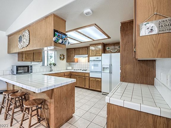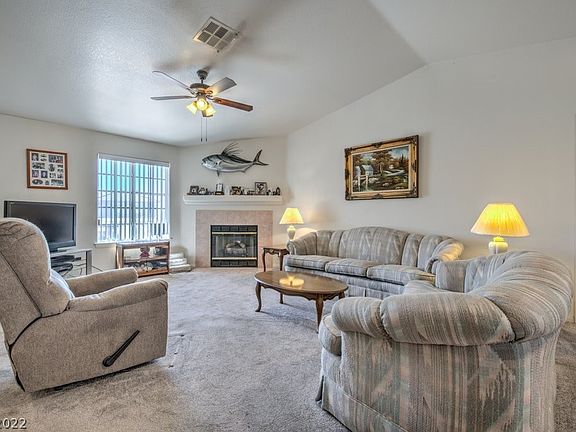 Stick-built home w/vaulted ceilings and open kitchen, situated on nearly 1/2 acre! Trees, drip irrigation, sidewalks, & fencing all finish this property beautifully! 1,413 sqft offers 3 bedrooms & 2 baths. Kitchen boasts tile flooring, breakfast bar, built-in oven, gas cooktop, lots of built-ins, tile splash, & eating nook. Primary suite has walk-in closet, walk-in shower, & soaring ceilings. Fireplace in great room, blinds and fans installed. Extended covered back patio offers gorgeous oudoor lounging space. 220 ready at patio for hot tub! 2-car attached garage has room for storage, auto opener, & exterior door. RV parking options, covered parking area off back of garage w/walkway, storage shed, & new AC! Valley has 3 wineries, 3 golf courses, gaming, and endless trails for hiking/biking/riding/ATV/Jeep adventures. Just 1 hour to Las Vegas!