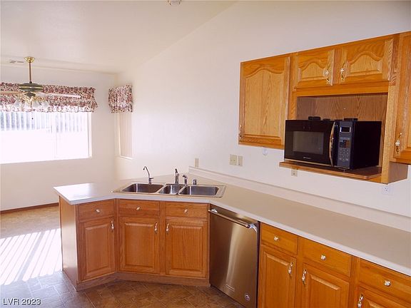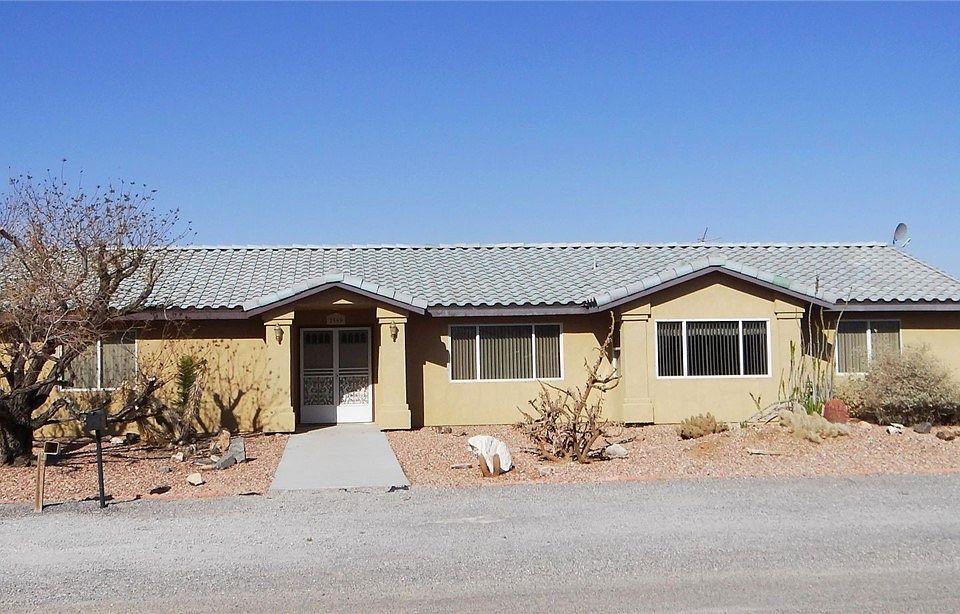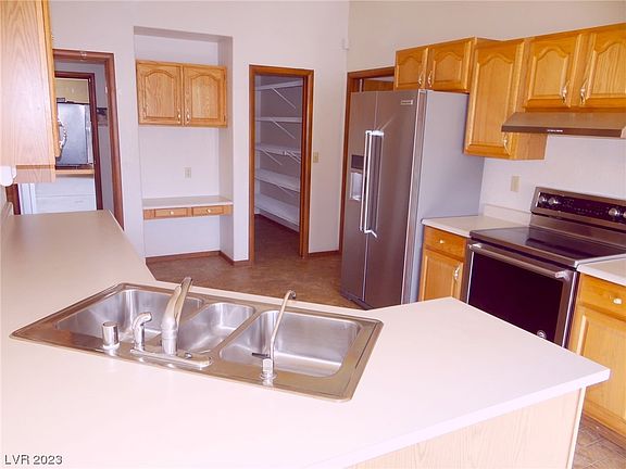Lovely 2128 sqdt home on half acre in nice custom home area with easy access to town. Split floor plan separates primary bedroom from 2 guest rooms. Bedrooms are spacious with extra large walk-in closets. 15x14 Formal Living room, plus 19X8 family room with slider door to covered patio. Family room ideal to use as office, or hobby room or even a gym. Kitchen with newer stainless appliances including refrigerator and 3 section stainless sink. Inviting sunny breakfast room with view of Mt Charleston. Laundry room with huge sink. 2 car garage has built in cabinets. Home is built to one side of lot allowing for area to park other vehicles or Rv or to add another garage. Low maintenance landscape. backyard is fenced and has irrigation system. Lovely home, good area, good price