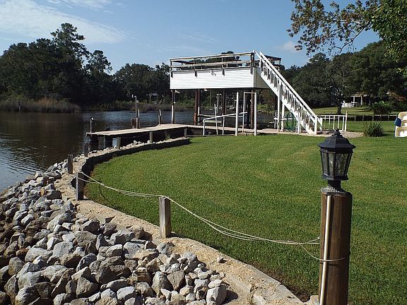 210 Ft waterfront on Alligator Bayou with a view of Dog River Mariner. Minutes from the waters of Mobile Bay. Lighted Pier with Boat lift. A fisherman’s delight. Landscape Lot with Azaleas & Camellias bushes. Grape arbor, Blueberry bushes, kumquats trees & large trees for shade.All brick home features 3 bedrooms 2 baths. Home has never flooded. Appreciate the view and quietness from the Sun Room that over looks the Bayou where you can watch natural at its best. Den area has bamboo hardwood floor & corner fireplace with natural gas ventless logs. Step saving kitchen with New stainless steel appliances, Granite counters, Breakfast area overlooking the water. Fresh paint & carpet. Updated bath rooms. Master bath has jetted tub. Heat pump heating system & Air conditioner 2 years old (per seller). Enjoy ceiling fans in all the rooms. Abundant of storage. 16 X 25 garage heated and cooled. Grilling area off sun room. Located on a cul-de-suc.