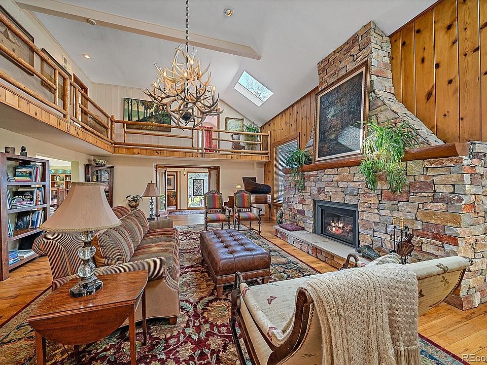 • Description: Wonderful Lodge Style With Massive Stone Fp, Antler Chandelier, Wide Plank Floors, Overlooking Walkway W/ Log Railings