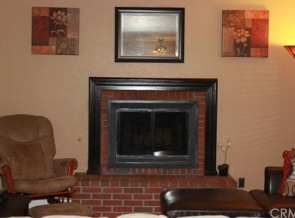 Two bedroom two bath lower end unit featuring inside laundry, living room fireplace, and front patio.