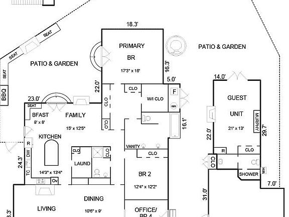 The one-of-a-kind 400 sq. ft. detached guest unit, reminiscent of a Carmel cottage, features a vaulted ceiling, Murphy bed, gas fireplace, and a luxurious bathroom with a curbless shower and heated flooring. It offers its own outdoor seating area, perfect for relaxation, ideal for visiting family, or multigenerational living.