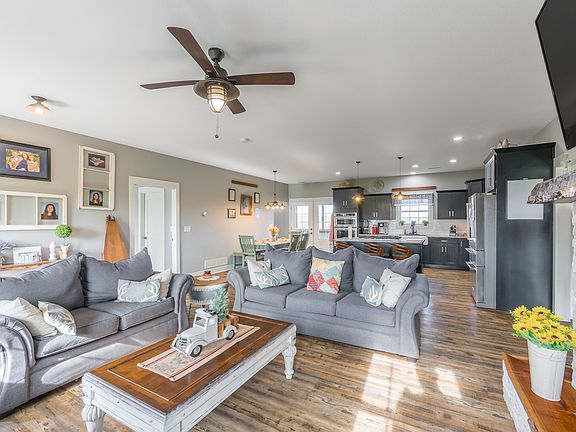 Presenting a beautiful custom home on a well-rounded combination farm. This 3 bedroom, 2 bathroom home presents an open floor plan loaded with features like first floor living, wood fireplace, 3 season room and plenty of windows for abundant natural light. As you walk through the front door, you enter an open living room that flows into the kitchen and dining space. You'll love the spacious custom kitchen for its granite countertops complimented by custom cabinets, a farmhouse sink, and stainless steel appliances. Just off the living room, you'll find the primary suite with a walk-in closet and an adjoining bathroom featuring dual vanities and Jack and Jill shower. Across the other side of the living room is a full guest bathroom and 2 other bedrooms. Rounding out the finished living space is a mudroom/laundry room combo and a gorgeous 3 season room with westward views. The 3 season room overlooks crop fields that back up to timber with deer, turkeys, and other wildlife right out back! An attached oversized 2-car garage is well insulated, boasting high ceilings, lift master door openers, a wood stove, extra laundry hook-ups, and a walk-out door. One of the best features of the garage space is a concrete storm room that also functions as a safe. The home is situated on a beautiful recreational and income-producing farm where the hunting experience has been carefully designed and perfected over many years. An extensive list of hunting improvements includes 3 custom-built elevated blinds, food plot, mineral sites, water holes, and camera posts with hoods. Best of all, this was meticulously laid out to make use of cover and terrain to allow stealth access to the hunting blinds. Access is the key to long-term deer hunting success, and this property proves that with its long history of big bucks and plenty of turkeys. By the way, this farm is also known for abundant morel mushrooms, and there's even a stocked pond. Last but not least, this is an income-producing property with 39+- tillable acres that are cash rented to a local farmer. Please call today for your private tour of this well-designed and beautifully maintained property