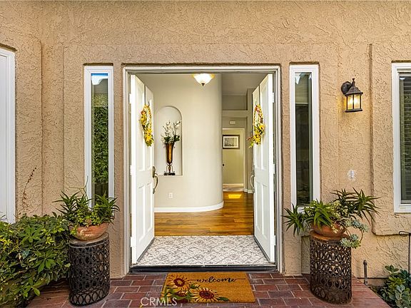 This delightful Single Story home is ideally located in the serene Villa Del Rio community of Yorba Linda and promises to meet your every expectation. A gated private courtyard and tranquil path leads you to the welcoming double door entry. High vaulted ceilings, contemporary paint colors, abundant windows and patio French doors create a light and bright spaciousness throughout this open floorplan. The large and comfortable living room features a cozy fireplace and glistening wood flooring which continues into the adjoining dining area and kitchen. Beautiful cabinetry, granite counters with custom backsplash, stainless appliances and a sunny garden window complete the remodeled kitchen. French doors lead to a lovely back yard with large covered patio area, above ground spa, manicured landscaping, fruit trees, grass lawn and newer vinyl fencing. The spacious primary bedroom suite features vaulted ceilings, dual closets (one walk-in), double vanity, soaking tub with shower and a private French door leading to the outdoor spa. Two secondary bedrooms, each with mirrored closet doors, are serviced by another full bathroom featuring a dual sink vanity and shower/tub. Attached dream garage is finished with epoxy flooring and ample built-in cabinets. Other property highlights include two skylights, newer vinyl dual pane windows, updated HVAC and a whole house fan. This home exudes Pride of Ownership! No Mello Roos and low HOA Dues. Top rated Bryant Ranch Elementary, Travis Ranch Middle School and Yorba Linda High School. Easily accessible to: Brush Canyon Park and Box Canyon Park (both with sports courts and play areas), walking and exercise trails, dining, shopping and access to the 91 and 241 freeways.
