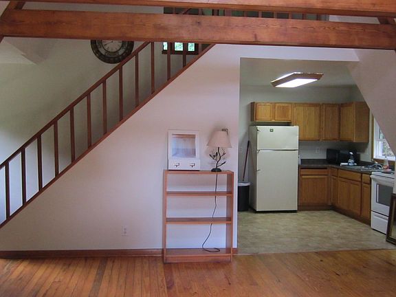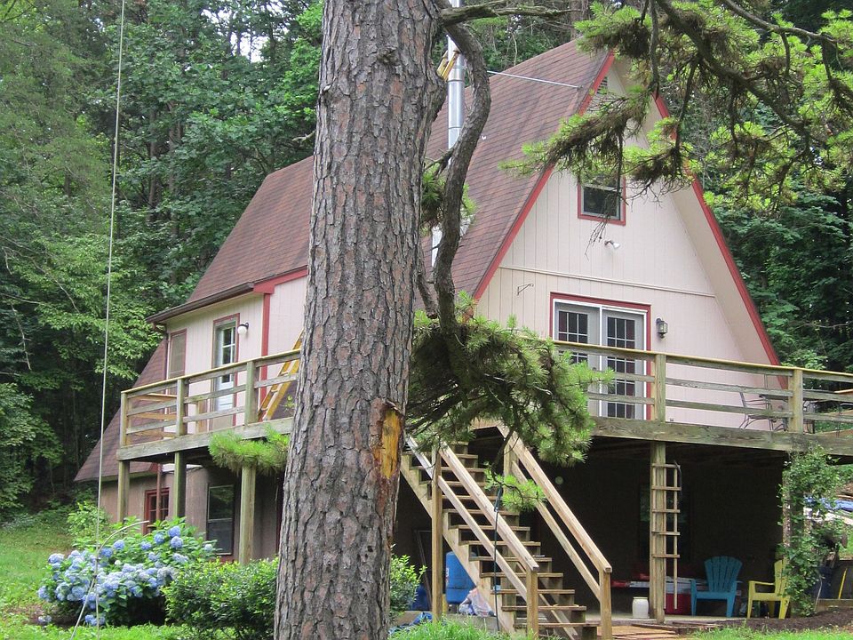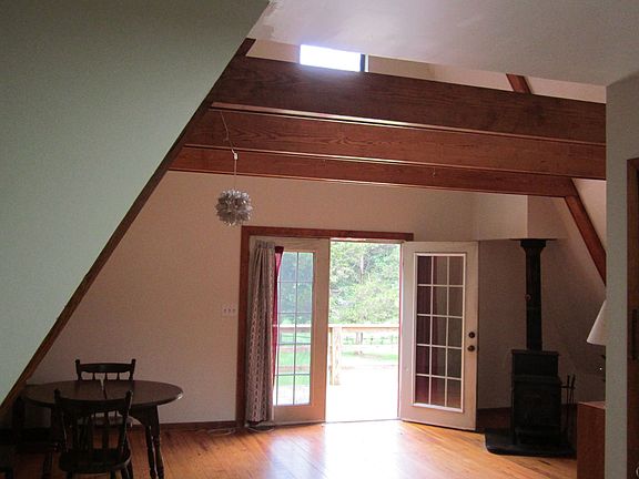 Charming A-Frame, Lovely Country Location. 15 min to Pantops. Main floor has open floor plan, cathedral ceiling, 1 bdrm, hardwood floors, a kitchen/dining area, wood stove, French doors to wrap around deck, upstairs loft bdrm. Basement has 1 bdrm, full bath, kitchen, washer/dryer closet. In all, 3 bdrms, 2 full baths. House can be separated so you could rent living space below for $500/mo, or offer privacy for family members. Sunny 2 acres, ideal for kids to play, gardens, chickens etc.