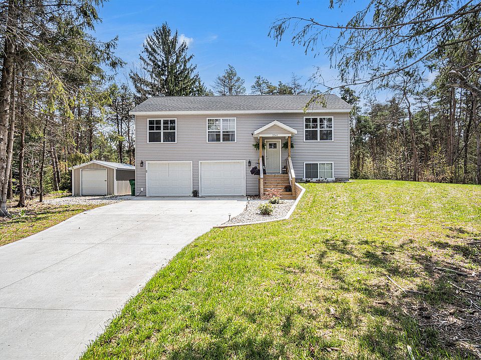 A MUST SEE! This newer home built in 2021 is in like-new condition throughout. The spacious floor plan offers an open concept with living room and kitchen, soaring ceilings with canned lighting and 2 main floor bedrooms and. The large primary suite offers a walk-in closing and bath. The lower level provides plenty of storage space, laundry, and large rec room/family room area, 1 bedroom and a full bath. Situated on a private, wooded lot with outdoor deck, beautiful firepit area and outdoor shed. Great location – close distance to Stonegate Golf Community and highway access. Call today for your personal showing. Buyer and buyer's agent to verify all information.