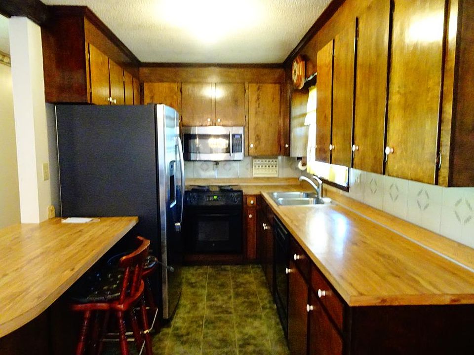 Relax on the rocking chair front porch or the spacious back deck, the greatroom has a free standing wood stove, wainscotting and wood like beams, the dining area opens to the back deck, breakfast counter, kitchen is equipped with range, microwave, dishwasher & refrigerator; off the dining area is the laundry room with washer & dryer, 3 bedrooms 1 bath, carport with storage, asphalt driveway.