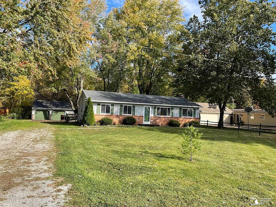 Ready to move in. Three bedroom one bath ranch, completely redecorated, including paint and new laminate throughout. Features include open floor plan, step down family room with wood burning fireplace, eat in kitchen with large snack bar, bath has walk-in shower. Go out back to private yard, 30x16 deck, firepit and fenced rear yard. Detached garage is finished inside and heated with free standing wood stove, with 20x10 attached annex. Location is perfect for outdoor oriented family with White Park across the street and Bedford walking trails. additional updates, HVAC 2020,counter top 2021,Roof2021