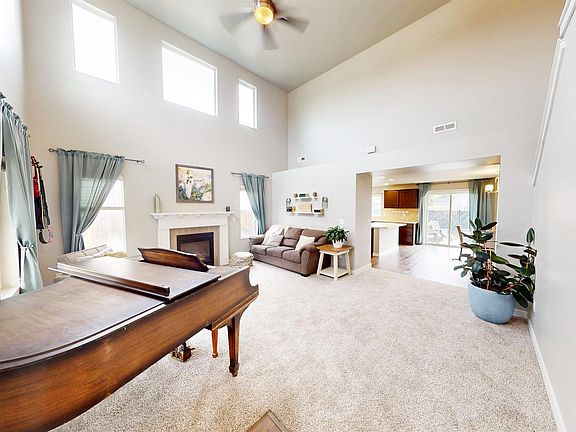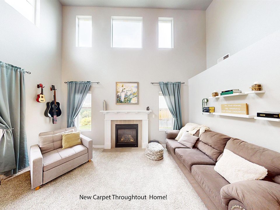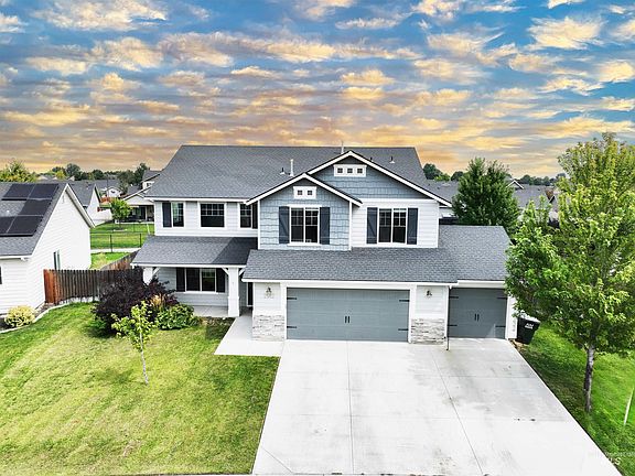 Step inside this beautiful Kuna home where soaring 20-foot ceilings and expansive windows flood the living area with natural light. The open floor plan flows seamlessly into the kitchen and family spaces, creating an ideal setting for everyday living and entertaining. Enjoy cozy evenings by the fireplace or movie nights on the big screen with the projector in the family room. The spacious primary suite offers a true retreat with a large walk-in closet and dual vanities. With 5 bedrooms and 2.5 baths, there’s room for everyone to spread out. The kitchen features a generous island, stainless steel appliances, and a dining space that opens directly to the backyard. Out back, you’ll find a fully fenced yard with a thoughtful design that adds privacy while still letting in natural light—perfect for enjoying the outdoors without distraction. Fresh new carpet throughout gives the home a clean, move-in ready feel. Located in the desirable Arbor Ridge subdivision, close to schools, parks, and greenbelt paths.