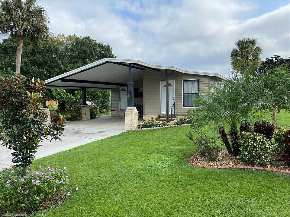 Beautifully landscaped 2BD/2BA spacious and move in ready mobile home situated on a corner lot. There is a bonus room with a separate entrance that could be used as an office or an additional bedroom. Master bathroom has a new vanity, shower and fixtures and newer flooring throughout the entire home. 10 x 12 shed for extra storage with power, RV parking with 50 amp hookup. Large 2 car carport spacious enough for patio furniture to sit and enjoy a cool evening breeze. AC (2019). Great location. Close to restaurants, shopping and doctors offices. Own your own land with no HOA fees. Come and take a peek!!!