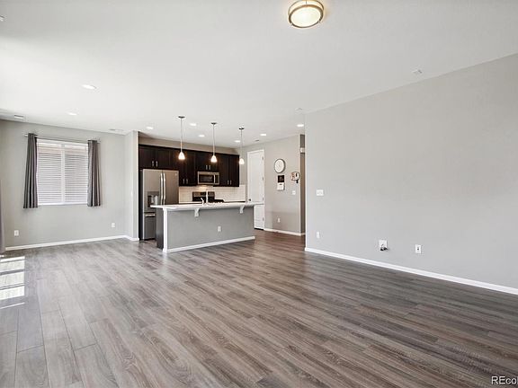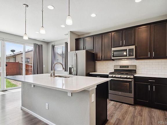 Sharp house! Light, bright, cheerful and open. Great neighborhood schools all nearby. Highly maintained. Seller has never had pets, plus no one has smoked inside the residence. Contemporary decor, lots of windows. Chef's kitchen, with extra-large island, 42" cabinets, roll-out shelves, quartz countertops with nice tile backsplash. Gas cooking, stainless steel appliances, pantry. Upgraded extra tall doors. Huge loft, in addition to three bedrooms. Three baths. Excellent curb appeal with covered front porch. Extended patio in backyard. Quiet, serene location. Neighborhood amenities include beautiful swimming pool, clubhouse, multiple parks throughout the neighborhood. Tasteful, pleasant colors throughout. Easy access to E470 for access to downtown and DIA. Check comps and active listings and you'll see this is a great price to buy low in a higher priced community.