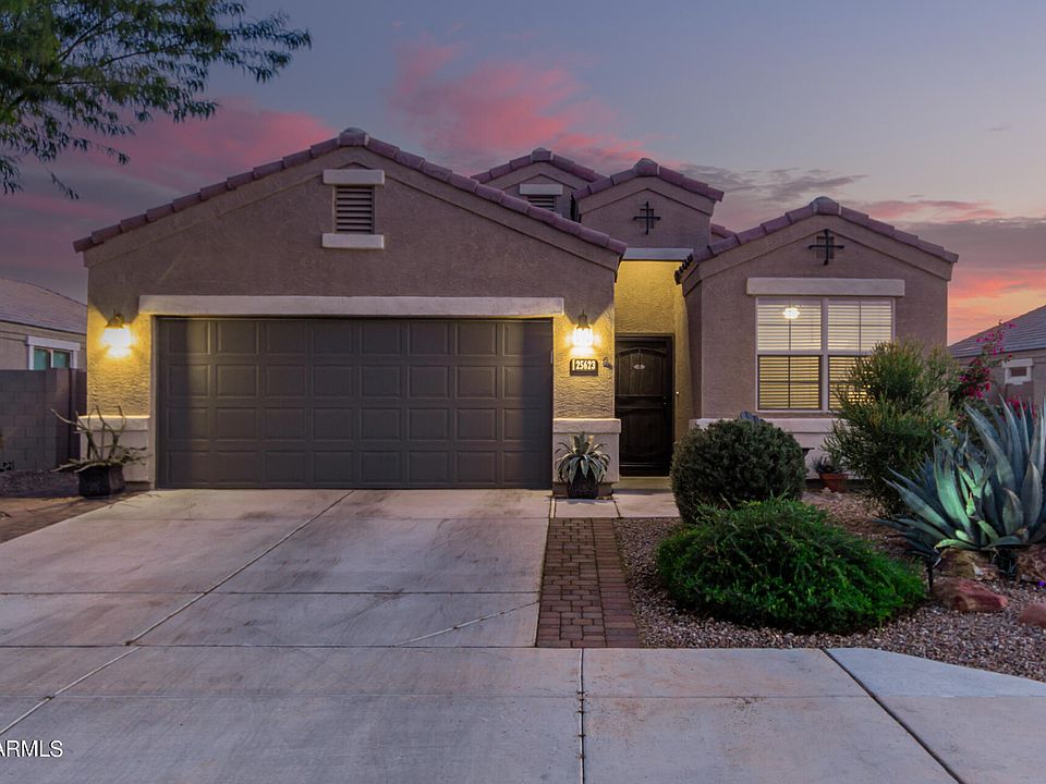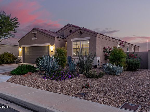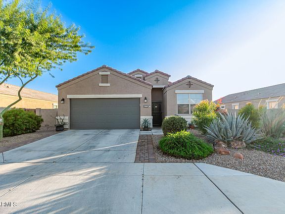 Charming single-level home nestled in Terravista. Only built in 2019 but has NEW carpet, paint, fridge, dishwasher, washer & dryer! Upon arrival, you'll cast your eyes on the beautiful UPGRADED landscape & metal screen door. Inviting interior showcasing FRESH paint, NEW light fixtures, & neutral tile floor. Kitchen offers chocolate-stained cabinets, speckled granite counters, window above sink, GE Stainless Steel appliances, RO system, w/brand NEW fridge, pantry, & island w/a breakfast bar. Main suite features NEW soft carpet, private bath w/dual sinks & spacious walk-in closet. Plus, ceiling fans in ALL rooms & NEW washer/dryer! Fabulous backyard w/covered patio, upgraded pavers, solar-powered landscape lighting, & delightful NEW spa! 2-car garage w/upper storage racks for extra space.