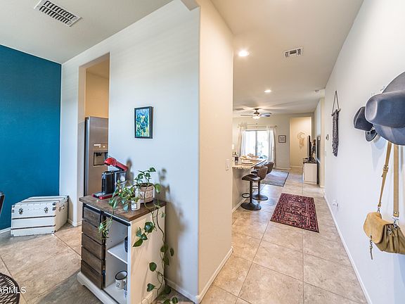 Welcome to the beautiful growing city of Buckeye AZ! This charming single story turn-key home built in 2019 features 20x20 tile flooring in all your main living spaces, an upgraded kitchen with granite island, stainless steel appliances, updated lighting and ceiling fans, wood blinds throughout the home, laminate wood floors in 2 bedrooms, upgraded height vanities in bathrooms with marble countertops. Primary suite has a walk-in shower and walk-in closet. The garage fits a full size truck and has a 220 outlet for smart cars. Enjoy 9' ceilings in this SmartHome that already has a leased solar system installed for low or no APS power bills. Fridge washer and dryer convey! Enjoy Terravista community parks and trees. Close to Hidden Lake and equestrian center.