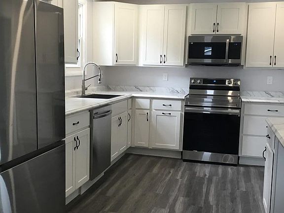 Easy living in this remodeled 2 bdrm ranch home, New white kitchen w/ breakfast bar, large living room, 1st floor laundry hook-ups, front enclosed sun room, pretty gray sub flooring throughout