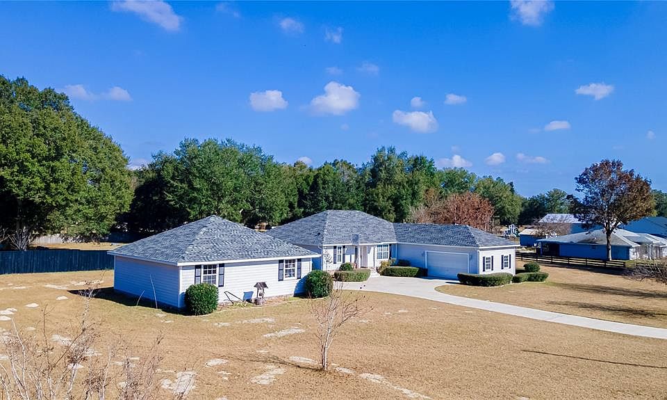 Welcome to Virmillion Estates in Summerfield, Florida! This beautiful home is situated on a spacious lot in a quiet neighborhood, providing the perfect mix of privacy and community. As you pull into the driveway, you'll immediately notice the lush green lawn and well-manicured landscaping that surrounds the over 2 acre property. The exterior of the home boasts a Hardee Board façade and a welcoming front porch, inviting you to come and stay awhile. Step inside and you'll be greeted by an open and airy floor plan that is flooded with natural light. The family room features a cozy fireplace, perfect for snuggling up on cool nights. The kitchen is a chef's dream, with plenty of counter space, modern appliances, and a breakfast bar for informal meals. The home boasts three bedrooms and two bathrooms, including a spacious master suite with a large walk-in closet and en-suite bathroom. Additional features include an oversized attach two-car garage, an additional 30X30 detached two-car garage, a covered patio in the back with double paned insulated glass windows, and a huge pole barn for all your extra belongings. The roof was just replaced in 2022 and the AC was upgraded in 2019. Don't miss your opportunity to make this house your forever home! Schedule a showing today.