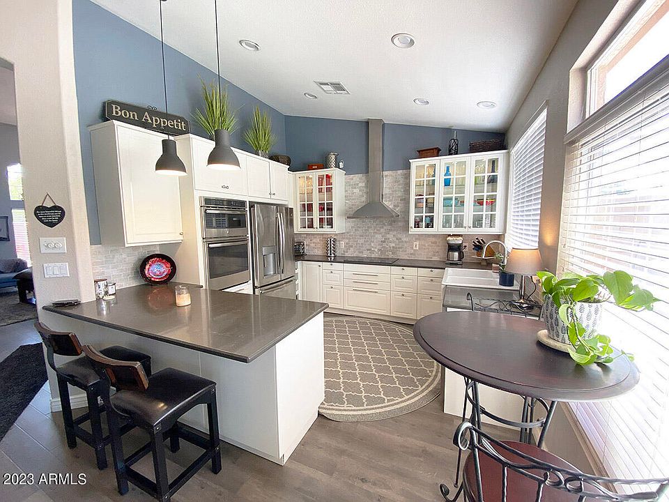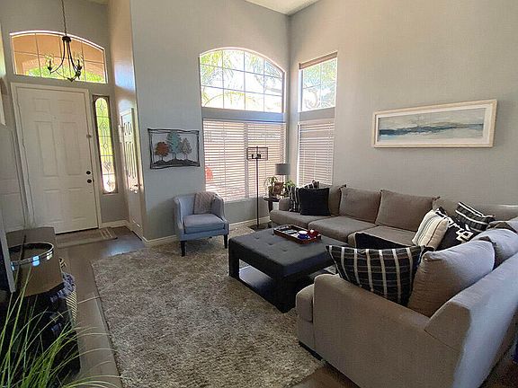 Tastefully done home in a great location w/in Raintree Ranch - corner lot with only 1 immediate neighbor! The home feels warm & inviting with high ceilings, excellent paint choices, & updated flooring. Remodeled kitchen with high-end cabinets - soft-close doors/drawers, under cabinet lighting, quartz counters, s/s appliances, industrial oven hood, tile backsplash, & farmhouse sink. Updated bathrooms with tile backsplash & new vanities. The backyard is professionally landscaped - covered patio, pavers, artificial turf (pet friendly), automated irrigation and ez-care vegetation. The home is energy efficient - reflective coating on underside of roof, extra attic insulation, dual pane windows & patio door, + a NEW high-efficiency Lennox HVAC! 2 car garage w/ overhead storage racks.