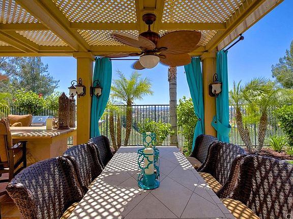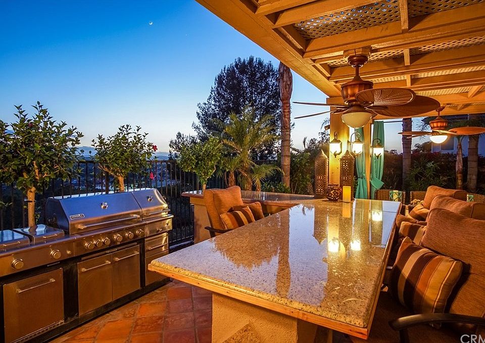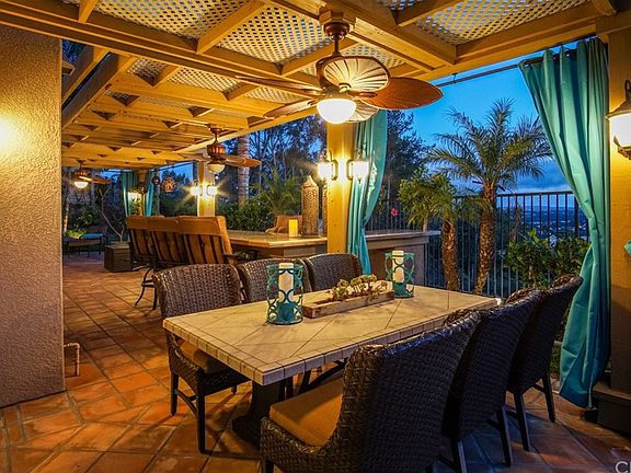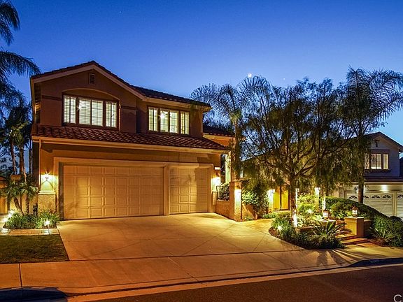 Gorgeous Pacific Hills Home, High on a Ridge on an Extra-Wide Terraced Lot and Single-Loaded Street, Offers Privacy and Views! Curb Appeal Galore includes Gorgeous Custom Hardscape and Lighting. Gated Courtyard Entry boasts Spanish Paver Tiles and Bubbling Fountain. Double Doors Opening to Formal Rooms with Soaring Ceilings, Plenty of Natural Light, and Beautiful Hardwood Flooring. The Spacious Kitchen/Family Room Includes a Center Island, Corian Counter Tops, Ample Cabinet and Pantry Space, a Large Breakfast Nook Plus Counter Seating, and Built-In Entertainment Center! Step Out to Wonderful Outdoor Living Spaces, with Serene Covered Patio Areas, Ceiling Fans and Lighting, Granite Entertaining Island, Outdoor Speakers, Lush Tropical Foliage with 23 Palm Trees, and Fabulous Views Toward the Coastal Hills. Enjoy Beautiful Sunsets and Dine Al Fresco Nightly! Wide Side Yards Wrap Around the Home and Ample Grassy Areas Combine with a Terraced Lot- Offering Privacy and Ample Space Between Neighbors! Additional Interior Features Include: Downstairs Bedroom with Built-In Wardrobe, and Adjacent Full Bath, Fabulous Master Suite with Endless Views, Master Bath with Walk in Closet and Separate Tub/Shower; Spacious Secondary Bedrooms; Handsome Stacked Stone Fireplace and Wood Mantle, Ceilings Fans, Base and Crown, Built Ins, Added Recessed Lighting, Plantation Shutters, Garage Storage, and Much More! No Mello Roos, Award Winning Schools and Lake Mission Viejo Membership Too⦠Welcome Home!