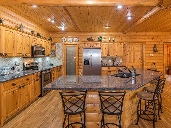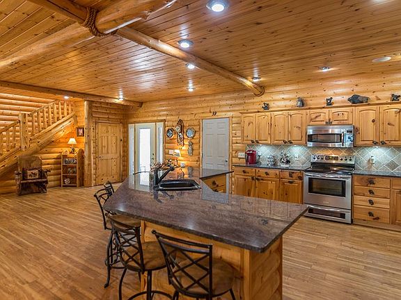 featuring a main level open floor plan with a custom kitchen, walk-in pantry, floor-to-ceiling stone fireplace, lakeside sun room, and spectacular screen porch. The upper-level highlights include a huge lakeside master suite and lakeside family rm. w/massive stone fireplace, lakeside deck, theater rm., wet bar, and private office. All of this along with a heated 2 car attached garage and a charming bunkhouse with living rm., sleeping area, and 3/4 bath.