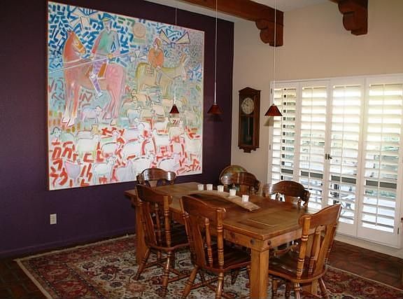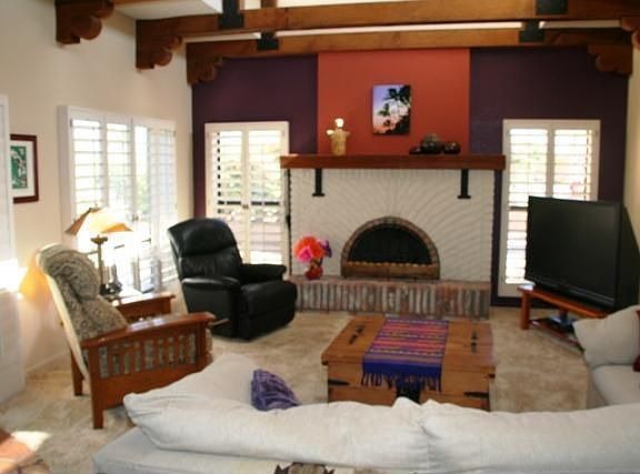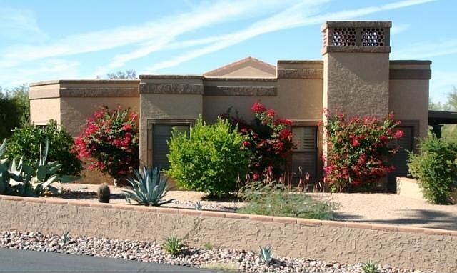 Southwest style with panoramic views! Enjoy the Arizona experience in this charming home. Saltillo tile floors, Mexican tile bathrooms, painted & hand rubbed kitchen cabinets all combined create this lovely home. The living/dining room has a wood-burning brick fireplace with raised hearth, raised wood-beam ceilings, clere story windows for natural light and wet bar for entertaining. The kitchen has stainless appliances. Plantation shutters thru-out. Patio is partially covered with fire pit & fantastic views. Rio Verde is an Adult Community with golf memberships available. Also enjoy tennis, pickleball, large swimming pool, fitness center, art classes, library, ASU lectures, local Pub & dining, post office, community Church. Furniture available outside escrow