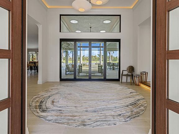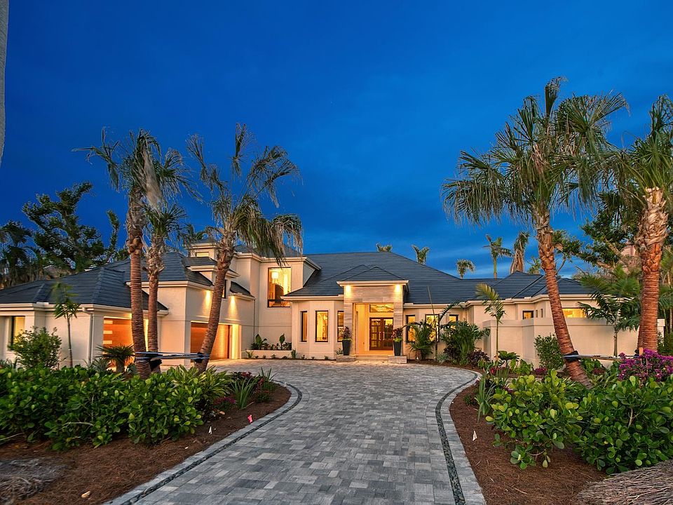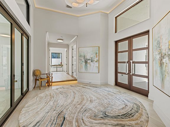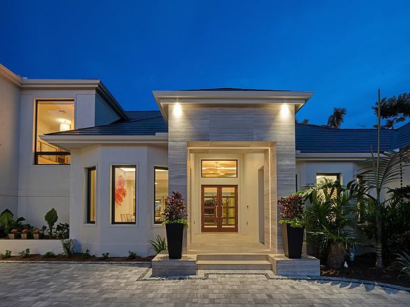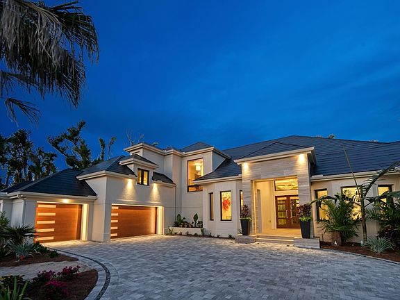 Behold this season’s most architecturally inspiring contemporary masterpiece with stunning water views. A first of its kind in the area, this home features a gorgeous Tesla roof with a fully integrated solar and energy storage system. The electric bill averages between $20 to $30 a month. The roof is complemented by the new paver drive featuring black Mexican pebbles, an arched marble entry along with custom doors. Upon entry, your eye is drawn towards the commodious covered lanai to the invisible edge pool and the private waterway beyond. The state of the art kitchen lives beautifully with the interior living spaces which wrap around the lanai. On the main living level you will also find a cozy den and the primary retreat showcasing a beautifully appointed bath. All of the guest suites are located on the upper level with a central lounging area. Step into this exceptional one of a kind offering and be WOWED!