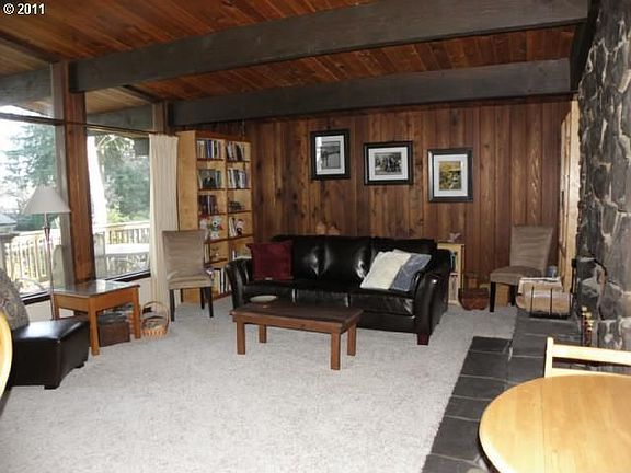 Stunning mid-century contemporary home with tons of character! Vaulted ceilings and exposed beams give the main floor a spacious and open feel. Master is nicely separated from the rest of the house and features gorgeous views! Both downstairs bedrooms access the private deck. Great opportunity in the hills of Southwest Eugene!
