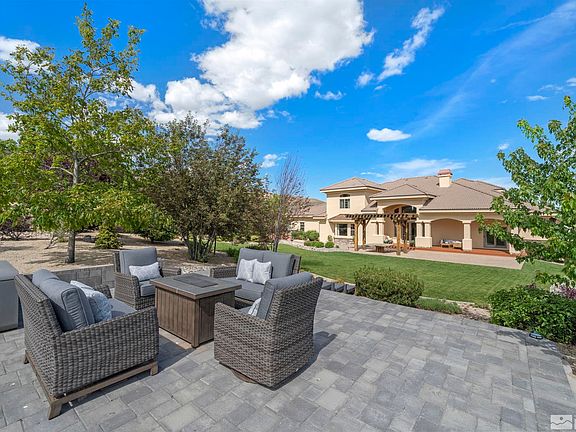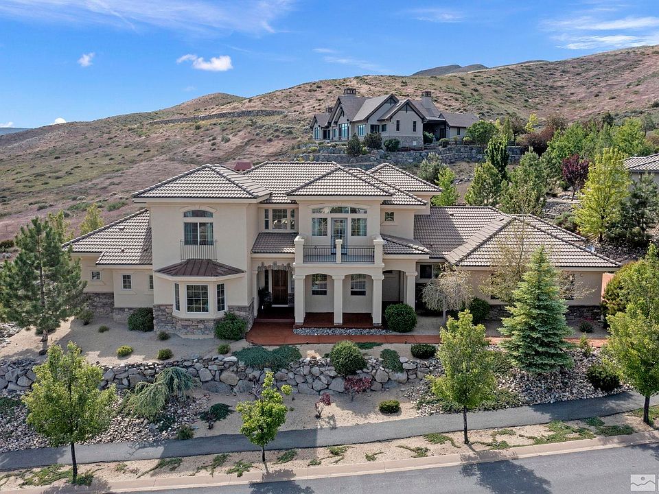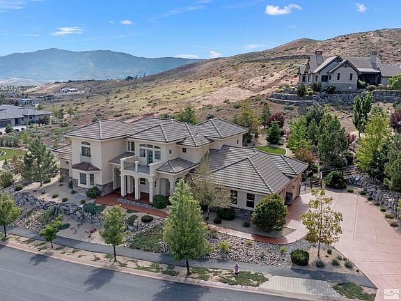 Watch the mesmerizing sunsets and spectacular panoramic views of Reno and the Sierras from your viewing deck as you take a sip of wine and enjoy the warmth of your fire pit. Set in the gated confines of Champion Hills at Somersett, this custom built home has been newly renovated with top of the line appliances, leathered quartzite countertops, beautiful hardwood flooring throughout, ensuite baths for all bedrooms, and an RV garage. Enjoy nearly 3/4 of flat acreage and a fully landscaped yard with mature, trees, walk right out your door for hiking trails and experience truly magnificent mountain and city views. This is the ultimate home for those looking for privacy and tranquility. The primary suite is located on the main level along with its own door to the patio and backyard. There is a multi-purpose room that can be utilized as an office, family room or a guest room. The Town Center offers many amenities including swimming pools, tennis, pickle ball, gym and 9 hole golf. The owner is a designer and a licensed NV real estate agent. Home can be sold with furnishings.