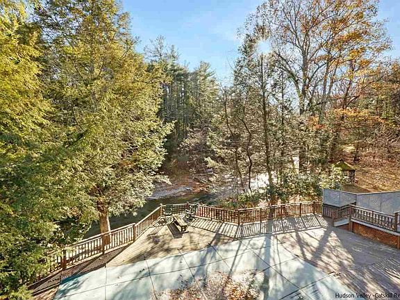 Discover this idyllic WOODSTOCK STREAMSIDE 6500 sq ft property on 2 landscaped acres and an easy 10 minute walk into the center of town. The late mid-century modern style home is cedar sided and has the potential to be a grand, amazingly spacious light filled home. Or, consider a combination of a commercial home/office center or an inn and retreat center - thus becoming an income producing investment. Begun, but not finished, it is ready to be completed to your exacting taste and standards. The home boasts a pool with deck as well as its own small private swimming hole. Or, easily meander off the property and in a few minute walk from the poolside decking you'll discover more of the Sawkills' famed swimming holes. The 880 sq. ft living room/event space has a fireplace and is framed by a large wall of floor to ceiling windows overlooking the pool and river. This living room/event space connects to the main kitchen and dining room. The 780 sq ft 3rd floor master suite has its own sauna, bath alcove, office and living space and opens onto a deck with expansive treetop river views. Two more large bedrooms with fireplaces have en-suite bathroom possibility. Additional space on the 2nd floor could be a separate 1 bedroom rental unit with kitchen, bath and living room or used as additional bedrooms and office.There is extensive decking (from all 3 floors), mature landscaping with rhododendron and magnolia, and stone walkways to the river's edge. This property just needs completion of the partial renovation to blossom. The past owner built private ground level access to 9 more rooms that include 2 more bathrooms and a private hallway that also connects to the upper level. A large 2 car garage and outdoor parking for 20 cars complete the various opportunities that this site offers. This unique property offers a large palette just waiting to be finished and emerge enticingly to become apart of the growing visionary Woodstock community.
