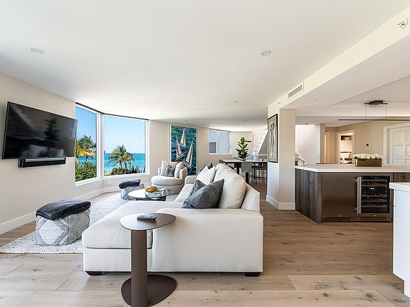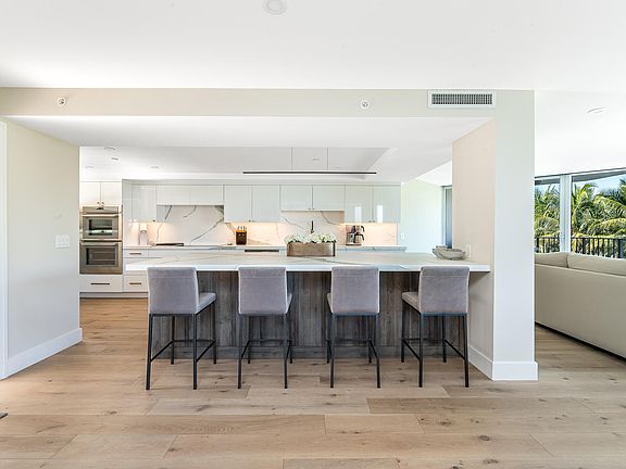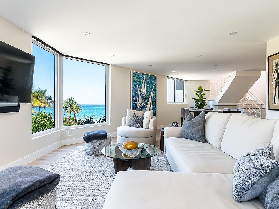 Vacation everyday in this beautifully renovated 2 bedroom, 2.5 bath oceanfront masterpiece located on 450 feet of pristine private beach. Enjoy panoramic ocean views and sunrises from this spectacular residence basked in an abundance of natural light from all new impact windows and sliders. Luxurious new gourmet kitchen sparkles and delights with stainless steel Thermador double ovens, refrigerator, dishwasher, induction cooktop and Wolf grill. Porcelain countertops highlight the custom cabinetry along with the wine storage and beverage center. Modern primary bath with raised vanity, dual sinks and glass encased shower. Throughout the home there is new engineered white oak wood flooring, California style walk in closets, LED recessed lighting, and a separate laundry room complete with new Electrolux washer and dryer, new air conditioning system and newer water heater. Choose between white powdery sand or Highland Beach's tree-lined paved path for your daily walks. As an added bonus, there is a manicured, deeded private park on the Intracoastal across the street for your personal enjoyment. Have groceries delivered or visit the new Whole Foods and Trader Joe's - both within 2 miles of your front door. The Townhouses of Highland Beach is a boutique oceanfront community of only 72 residences featuring an on-site manager, salt water pool, BBQ/lounge area and gated underground garage parking. All ages and 2 pets welcome up to 20 pounds - a rare find in Highland Beach!