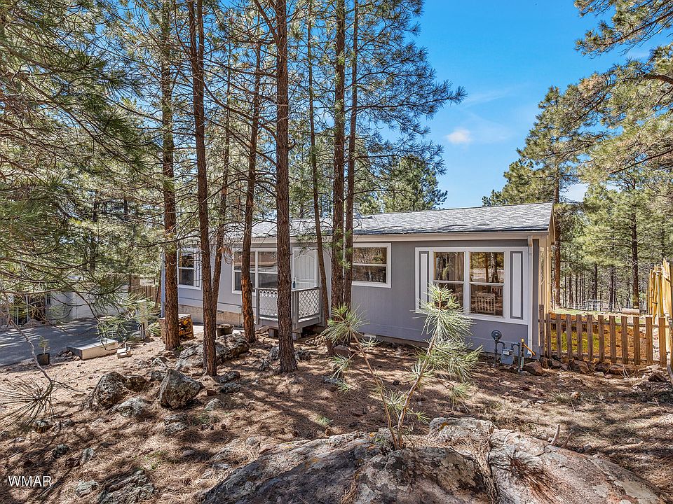 Welcome home to this beautiful 3-bedroom, 2-bathroom home in Kachina Village on one of the largest lots in the neighborhood with over 2/3 acre and backs to newly formed urban trail system. As you enter, you will find new laminate flooring, vaulted ceilings and a wood burning stove, perfect for those cooler nights. The kitchen has ample cabinetry, large kitchen island, gas range and an eat-in breakfast nook. The primary bedroom boasts an en-suite and has private access to the rear oversized deck. The additional two bedrooms share a hall bathroom. Do not forget to check out the laundry room/pantry before heading outside to the cool sunshine + tall ponderosa pines. From your expansive deck, you can sit and enjoy the unobstructed views of the tall pines year-round... Parking is plentiful with many slab areas and check out the additional storage shed that is brand new for all your storage needs. Additional upgrades to this home include: fresh new paint, waterproof laminate flooring, RO system in kitchen, smart thermostat, garden beds, painted stone/epoxy bathroom counters, and ALL NEW WINDOWS + EXTERIOR DOORS are being professionally installed June 2024 by Anderson. Do not wait, schedule your showing today!
