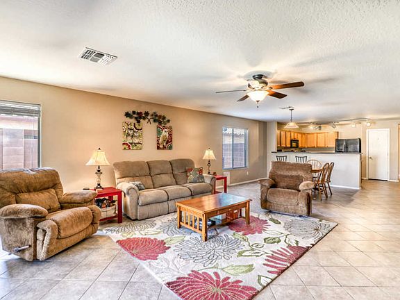 Move-in ready 4 bed/2 bath + Den single story home WITH A POOL in Buckeye! OWNED SOLAR PANELS = LOW ELECTRIC BILLS YEAR ROUND!! Desirable floorplan with open concept living area - spacious family room/dining room combo right off the kitchen. Kitchen has plenty of cabinet & counter space! Matching black appliances, R/O system, large breakfast bar & pantry. No carpet! Main living areas have a diagonal tile floor, while bedrooms & den have wood laminate flooring. Generous sized owners suite has plenty of room for your largest furniture, ensuite has dual sinks, soaking oval tub & separate walk-in shower, toilet room & large walk-in closet. Great sized guest bedrooms! Backyard is perfect for those hot summer days with your own private pool & hot tub plus a covered patio!