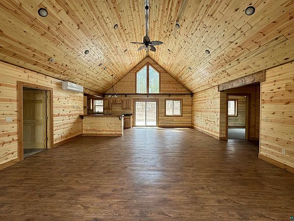 NEW NEW NEW! Stunning Log Home sitting high on a hill with 40.96 scenic wooded acres that abuts the Willard Munger Trail!! Beautiful vaulted front entry with corrugated metal accents and a covered patio for enjoying the views! Inside you have everything on one level with a pine interior and open living area. The kitchen offers granite counters and hickory cabinets. The primary bedroom offers a private en-suite 3/4 bath and walk-in closet. There are two additional ample sized bedrooms with a full bath. The mechanical room has on-demand hot water boiler, and another boiler for the in-floor heat, air exchanger, and washer/dryer hookups. Additionally there is a mini-split for air conditioning and heat The exterior is crafted from 8x8 engineered D-Logs providing for a flat interior pine finish. There is space near the house for a garage or pole building. The property is magical and very private, you are surrounded by trees and a trail that leads to a pond and easy access to the Willard Munger Trail. Spend your days outdoors making memories, enjoying the wildlife & recreational activities in the area.
