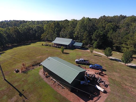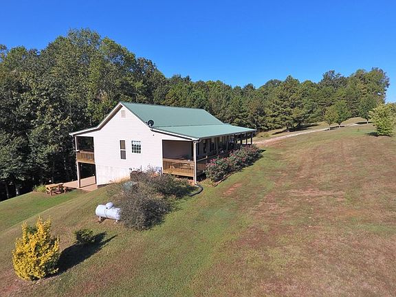 Great Room of this Cabin Style home features Tongue & Groove walls & 18 ft ceiling; Hardwood Floors & Fireplace. 3 BR, 3 BA, Walk-in Shower in Master BA. Kitchen has SS appliances & granite counter tops. Full, finished daylight basement. Front & Back Covered Porches; 2 Car detached carport. Workshop & Tractor Shed. On 40 beautiful acres w/ stocked pond; Great Hunting; Creek; Hardwoods & Pasture.