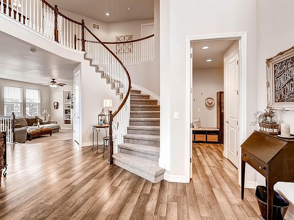 Luxurious home on an elevated, oversized lot in a quiet cul-de-sac offering all your heart desires! The main living area features a welcoming, sunlit foyer with sweeping staircase and leads to an open-concept great room. Dark,wide planked hardwoods and 42 in. espresso cabinets with slab granite, upgraded blown glass light fixtures, and natural stone fireplace (surround) create textural richness. Large gourmet kitchen features a center island, stainless appliances, gas range, and double oven. The classic floor plan with contemporary flair offers lasting appeal for entertaining and every-day living. Step from the kitchen to your upper deck and take in the gorgeous Colorado views! Upper level offers a spacious landing and open walkway to each of four bedrooms. The sumptuous owner’s retreat includes master bedroom with five-piece ensuite bath. Secondary bedrooms share two additional baths with beautiful finish quality and design. All enjoy terrific views of the mountains and reservoir. Upper and lower decks and patios provide beautiful space to enjoy warm summer parties with friends, family, and guests. Endless neighborhood trails lead to Aurora Reservoir for fishing, boating, swimming, and hiking activities. This one truly has it all!